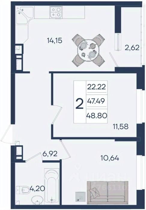 2 комнатная квартира с ремонтом 48.8 м², на 9 этаже в жилом комплексе ''Дом 101''.