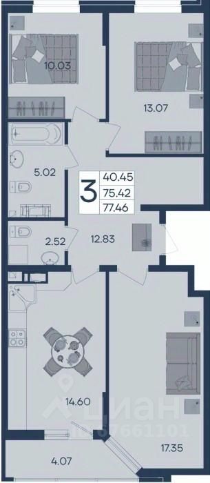 3 комнатная квартира с ремонтом 77.46 м², на 3 этаже в жилом комплексе ''Дом 101''.