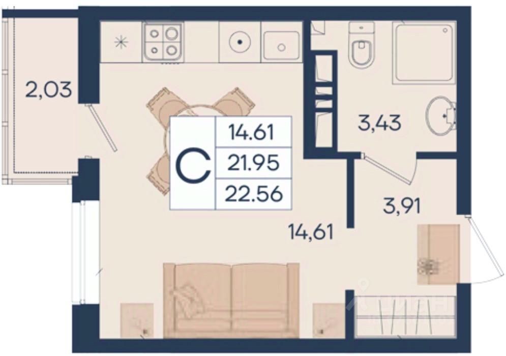 Студия 22.56 м², на 7 этаже в жилом комплексе ''Дом 101''.