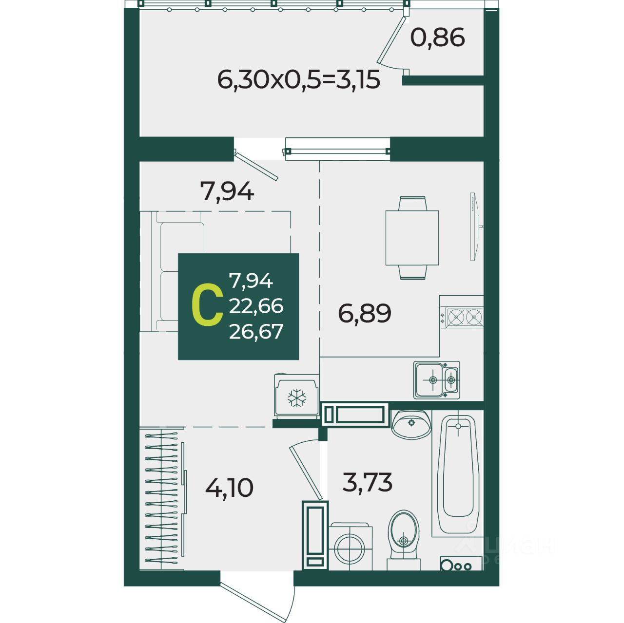 Общая площадь26,67 м2
