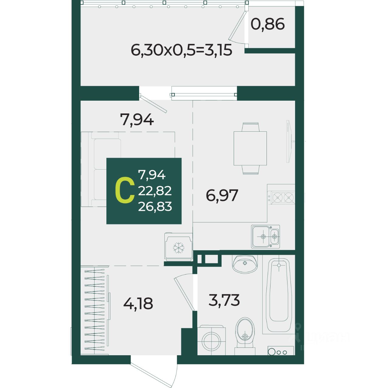 Общая площадь26,83 м2