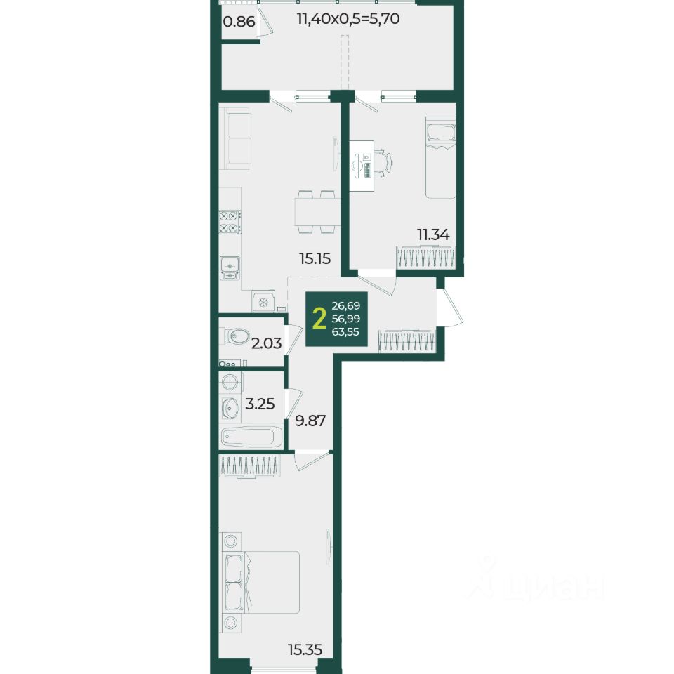 Общая площадь63,55 м2
