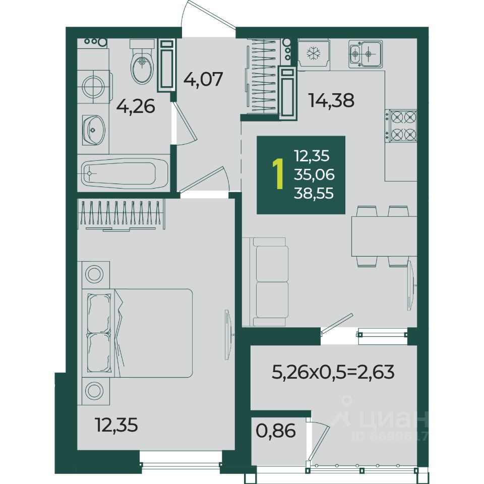 Общая площадь38,55 м2