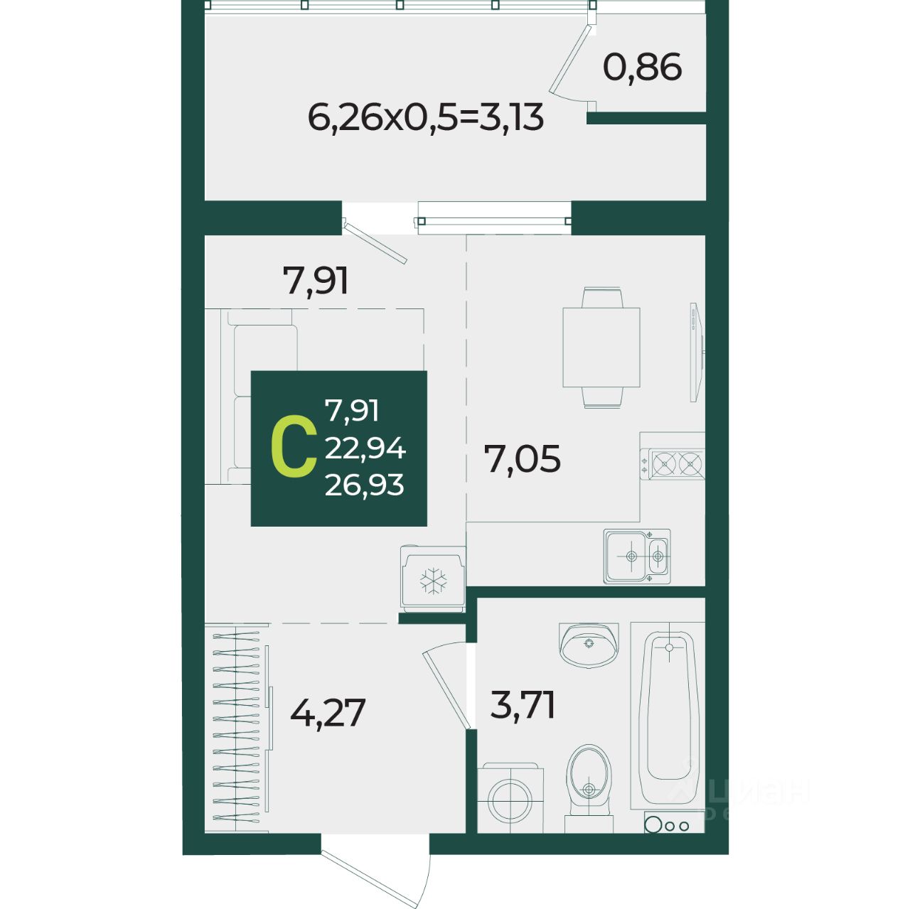 Общая площадь26,93 м2