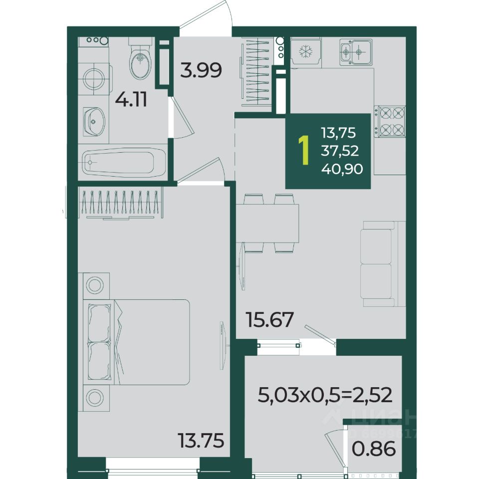 Общая площадь40,9 м2