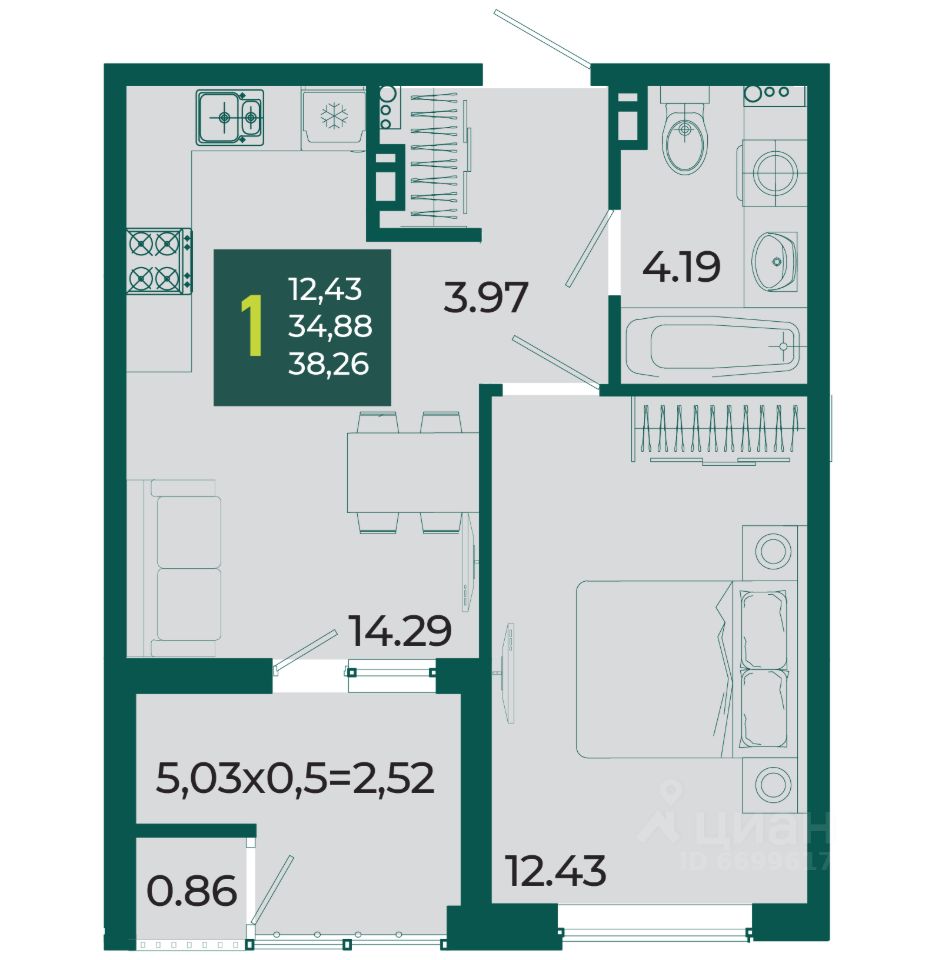 Общая площадь38,26 м2