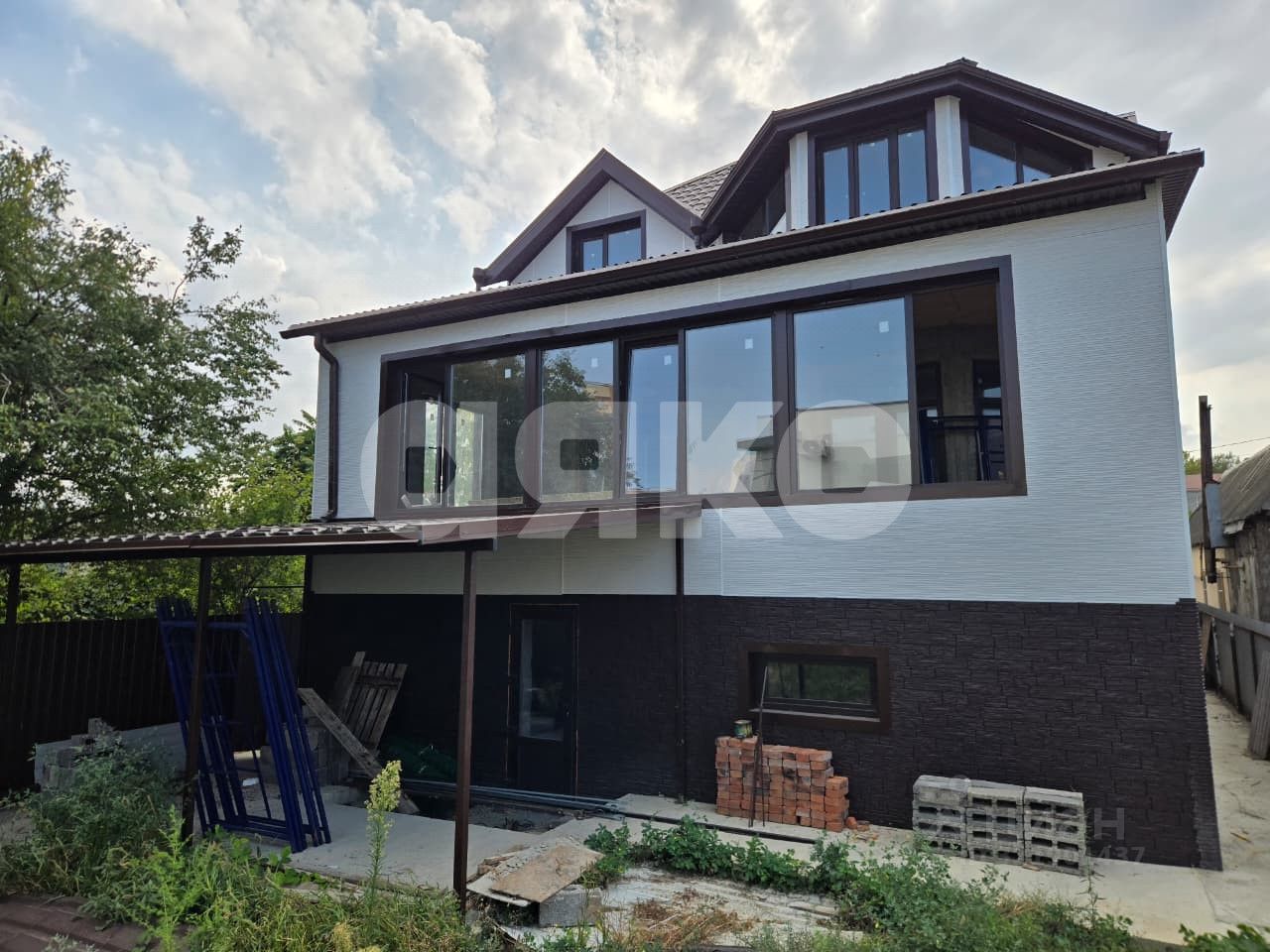 Построен по блочно-монолитной технологии: ленточный фундамент глубиной 100 см. плита высотой 13 см. стены керамзитный блок 25см. снаружи стены дома утеплены пенопластом 10 см и lдекорированы штукатуркой '' Короед''.. перекрытия первого и монолитные, толщиной 15 см. крыша утеплена минеральной ватой , общая толщина 8 см. установлены двойные энергосберегающие стеклопакеты . В доме выполнена разводка электрики , канализации и труб водоснабжения и отопления: 1 этаж дома - теплые полы, 2 этаж - установлены батареи. На входе предусмотрена терраса :
