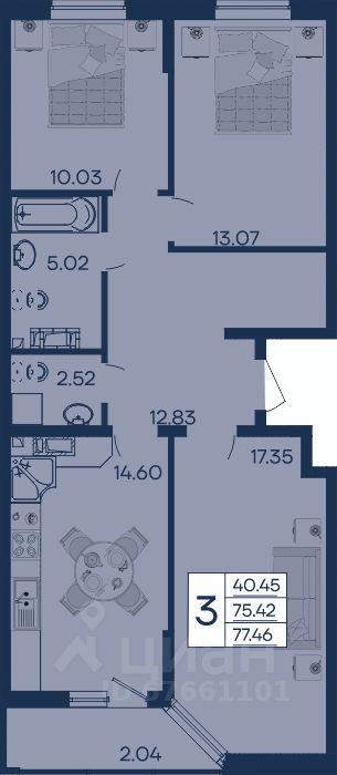 3 комнатная квартира с ремонтом 77.46 м², на 5 этаже в жилом комплексе ''Дом 101''.
