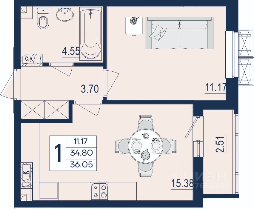 1 комнатная квартира с ремонтом 36.05 м², на 8 этаже в жилом комплексе ''Дом 101''.