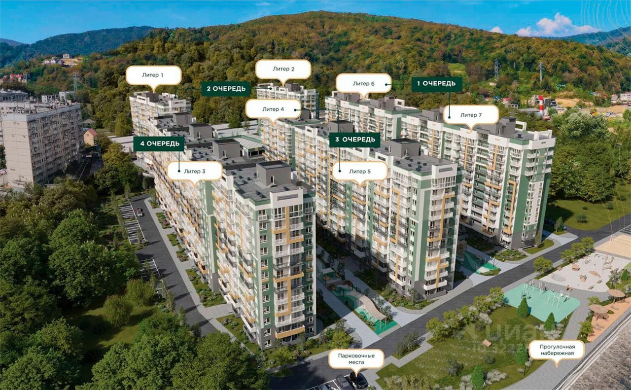 Покупателям в ЖК предложено множество планировочных решений: в наличии квартиры, как классического типа, так и европланировки. Из окон открываются виды на реку и горы. Квартиры сдаются без отделки.