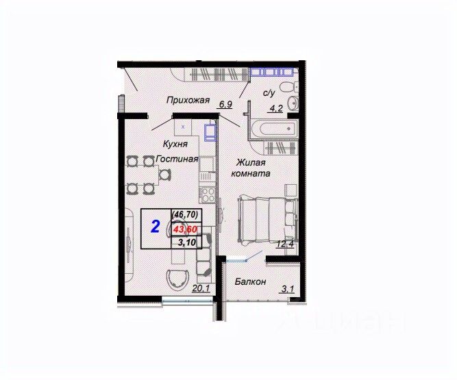 Общая площадь46,7 м2