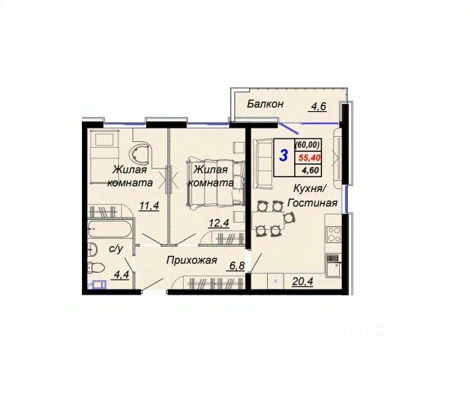 Общая площадь60 м2
