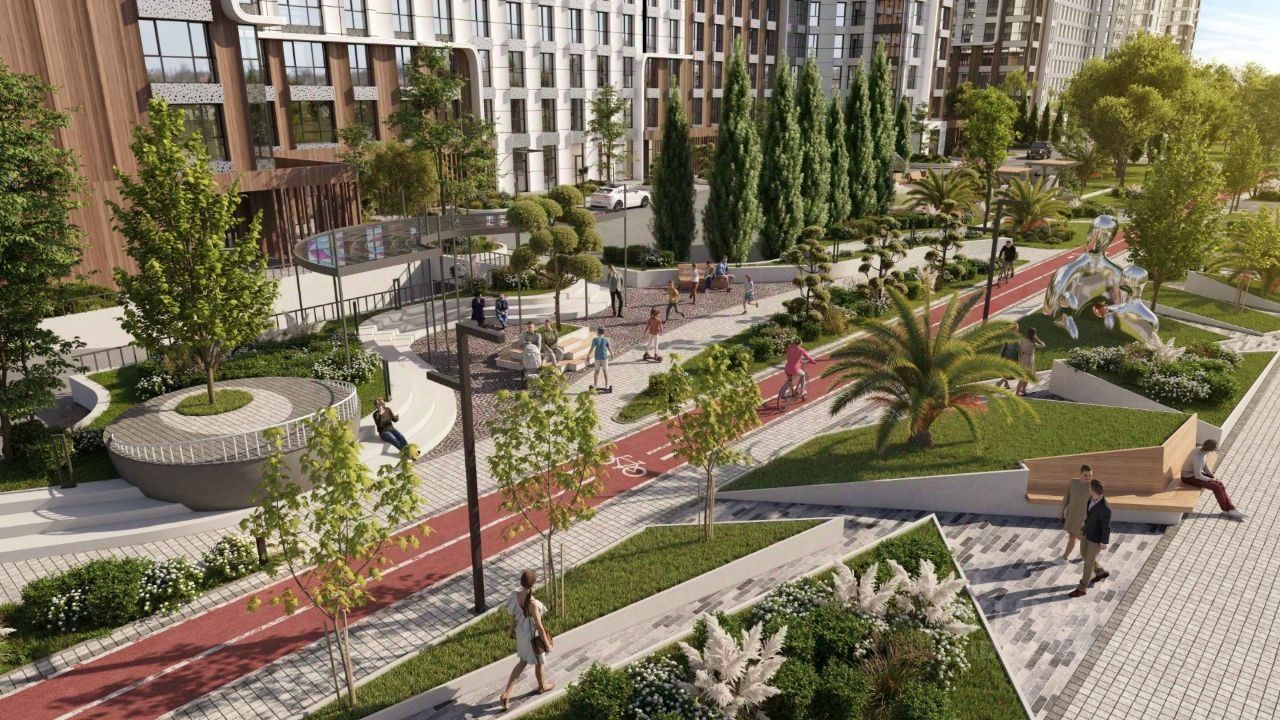 На закрытой территории комплекса выполнен ландшафтный дизайн, установлены безопасные детские площадки для детей всех возрастов, места для отдыха, зоны барбекю с беседками, спортивные площадки, установлен открытый бассейн. На территории также оборудована своя набережная протяженностью в 1,2км. Для владельцев автомобилей предусмотрен отдельный многоуровневый паркинг.