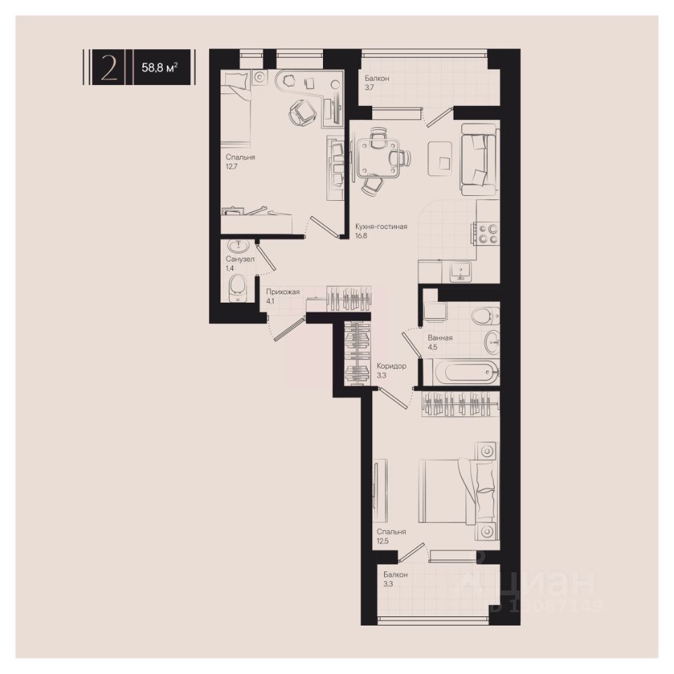 Общая площадь58,8 м2
