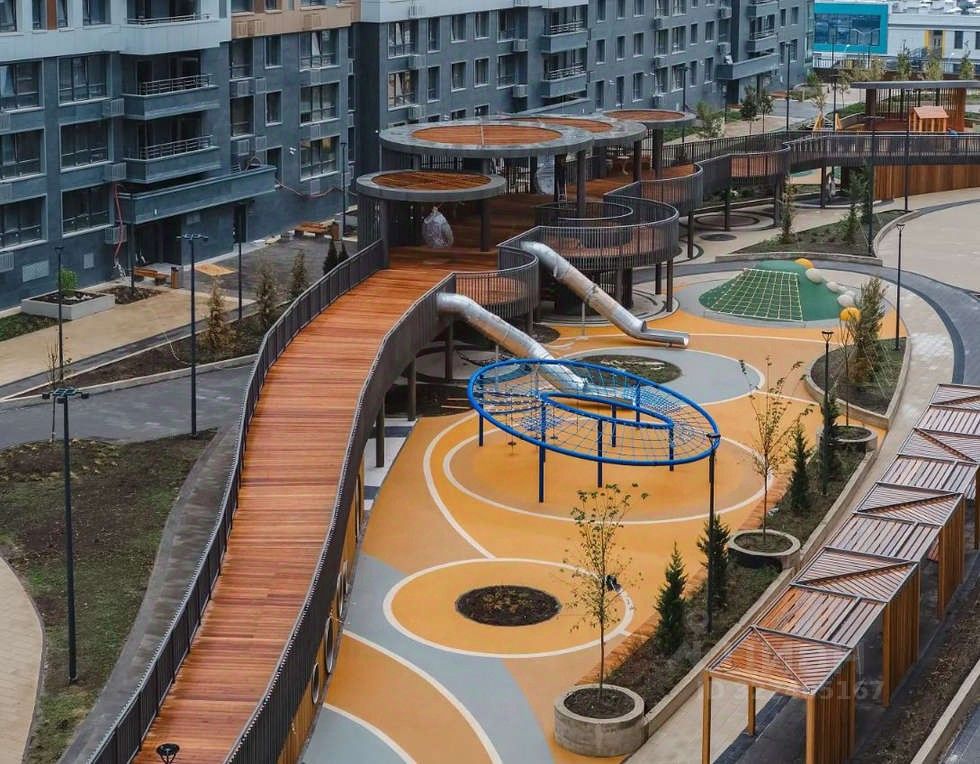 Безопасный двор без машин. Отличный и безопасный выбор для семей с детьми и для людей, которым важны удобство и комфорт не только внутри своей квартиры, но и за её пределами. Яркие и интересные игровые площадки для детей разных возрастов во дворе жилого комплекса.