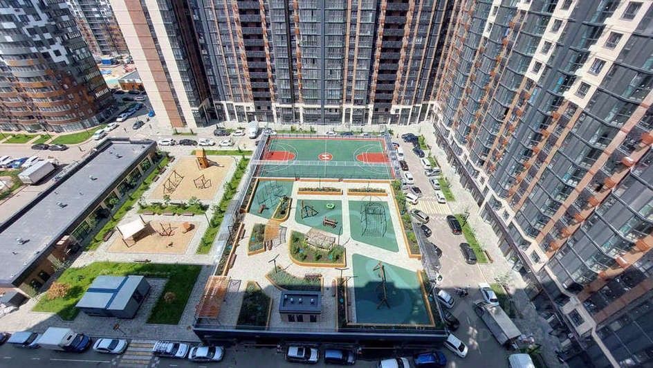 На территории дома обустроен двор-стилобат, где на первом уровне будет находиться крытая парковка, а на втором зоны отдыха с беседками и мангалами, детские и спортивные площадки.