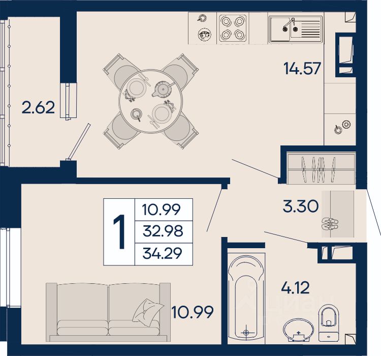 1 комнатная квартира 34.29 м² с ремонтом, на 4 этаже в жилом комплексе ''Дом 101''.