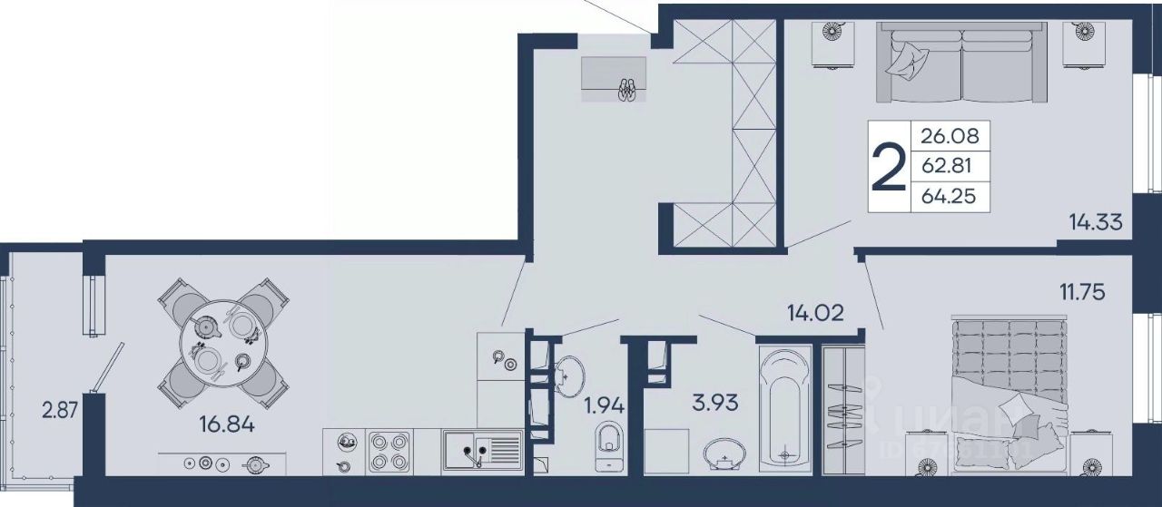 2 комнатная квартира 64.25 м² с ремонтом, на 3 этаже в жилом комплексе ''Дом 101''.