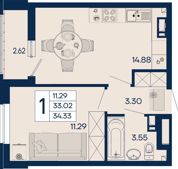 1 комнатная квартира 34.33 м² с ремонтом, на 3 этаже в жилом комплексе ''Дом 101''.
