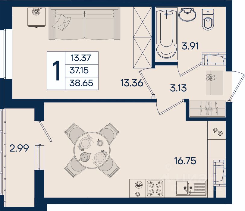 1 комнатная квартира 38.65 м² с ремонтом, на 12 этаже в жилом комплексе ''Дом 101''.
