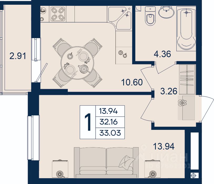 1 комнатная квартира 33.03 м² с ремонтом, на 2 этаже в жилом комплексе ''Дом 101''.