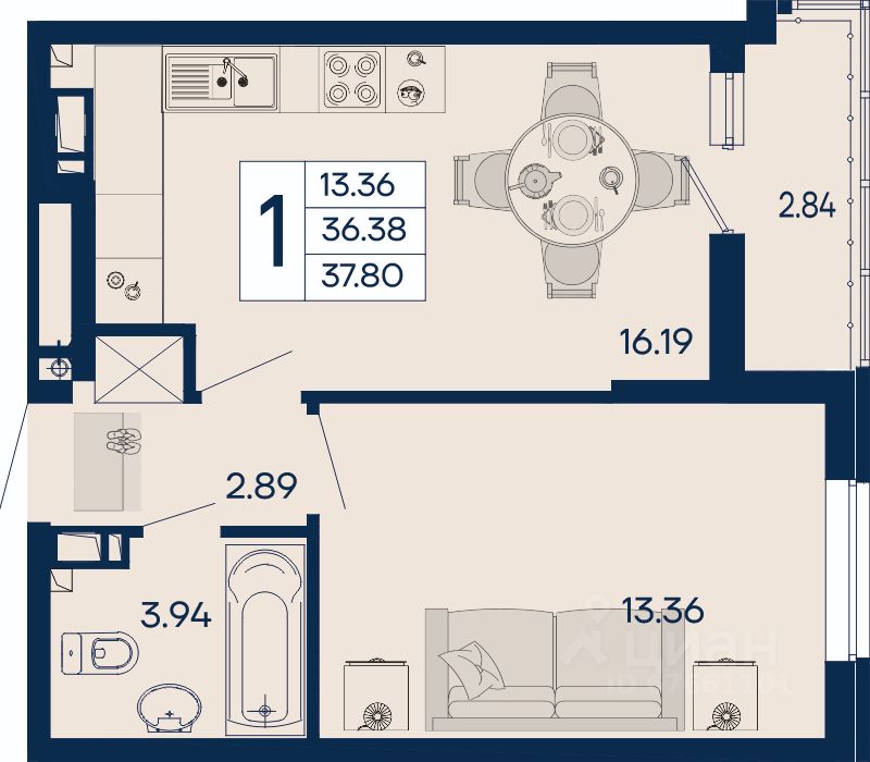 1 комнатная квартира 37.8 м² с ремонтом, на 7 этаже в жилом комплексе ''Дом 101''.