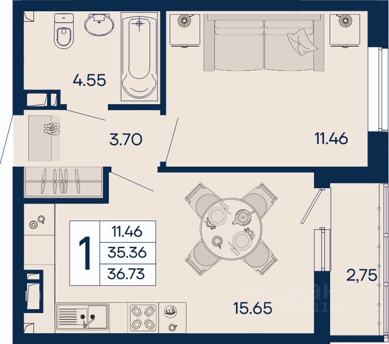 1 комнатная квартира 36.73 м² с ремонтом, на 8 этаже в жилом комплексе ''Дом 101''.