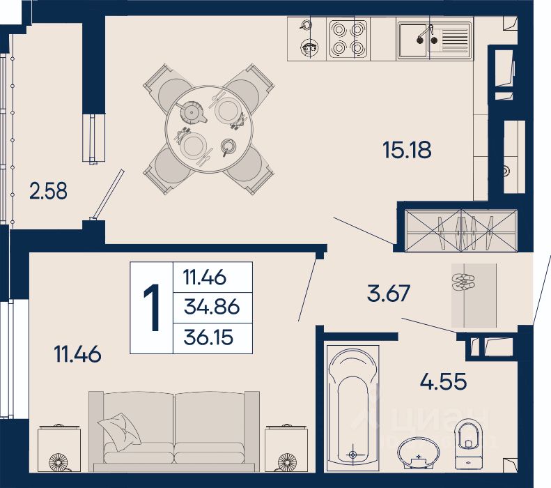 1 комнатная квартира 36.15 м² с ремонтом, на 8 этаже в жилом комплексе ''Дом 101''.