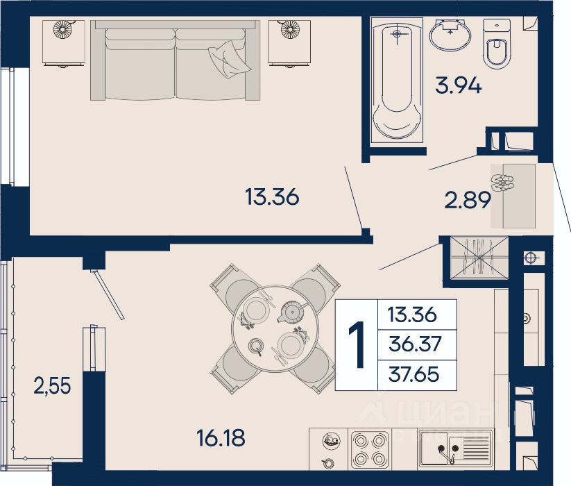 1 комнатная квартира 37.65 м² с ремонтом, на 8 этаже в жилом комплексе ''Дом 101''.