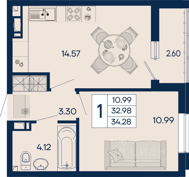 1 комнатная квартира 34.28 м² с ремонтом, на 8 этаже в жилом комплексе ''Дом 101''.