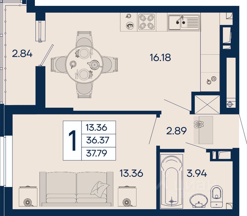 1 комнатная квартира 37.79 м² с ремонтом, на 9 этаже в жилом комплексе ''Дом 101''.