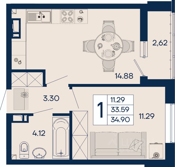 1 комнатная квартира 34.9 м² с ремонтом, на 9 этаже в жилом комплексе ''Дом 101''.
