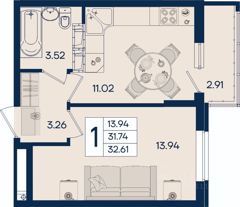 1 комнатная квартира 32.61 м² с ремонтом, на 10 этаже в жилом комплексе ''Дом 101''.