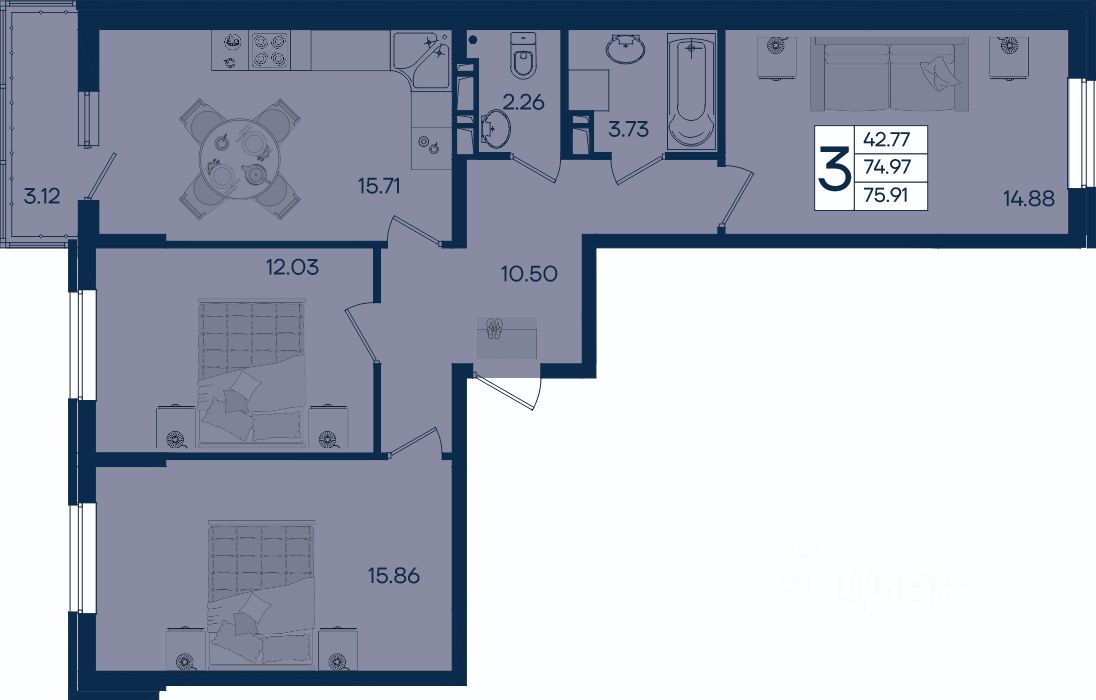 3 комнатная квартира 75.91 м² с ремонтом, на 7 этаже в жилом комплексе ''Дом 101''.