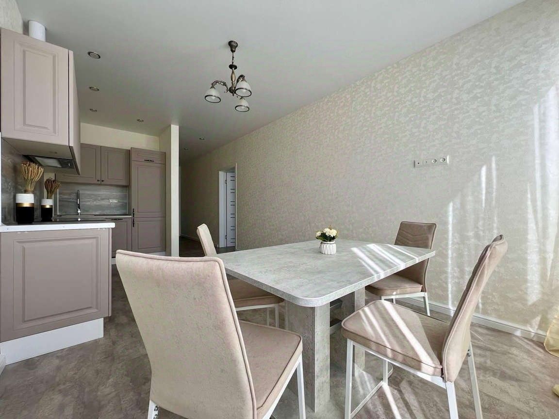 О КВАРТИРЕ: Общая площадь 46 кв.м, Кухня 18 кв.м, Спальня 20 кв.м . В квартире стильный качественный дизайнерский ремонт в нейтральных оттенках. Выполнена качественная электрика. Предусмотрено всё до мелочей. Установлена дорогая кухня со встраиваемой бытовой техникой. Теплый пол: кухня ,ванна, коридор и балкон.