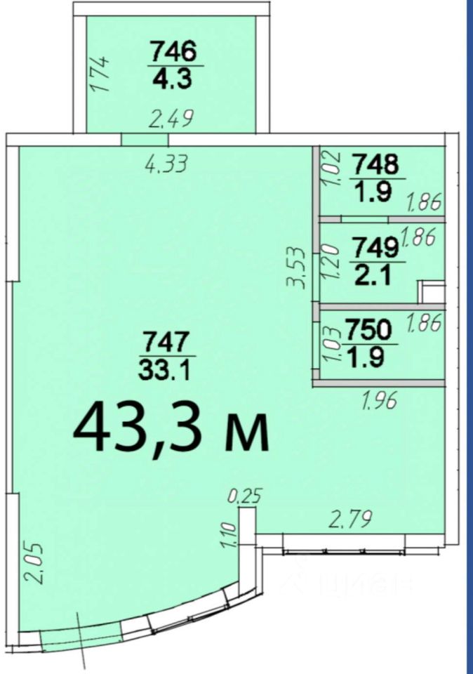 - общая площадь 43,3 кв.м., правильная форма, есть возможность увеличения площади за счет объединения с соседним помещением