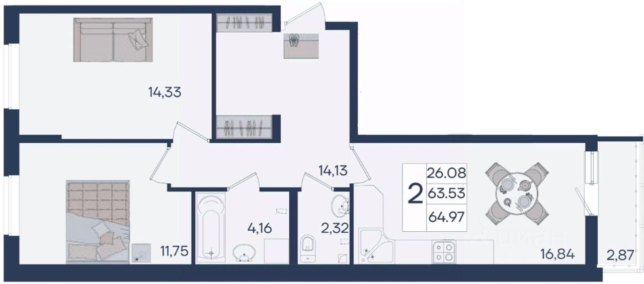 2 комнатная квартира с ремонтом 64.97 м², на 2 этаже в жилом комплексе ''Дом 101''.