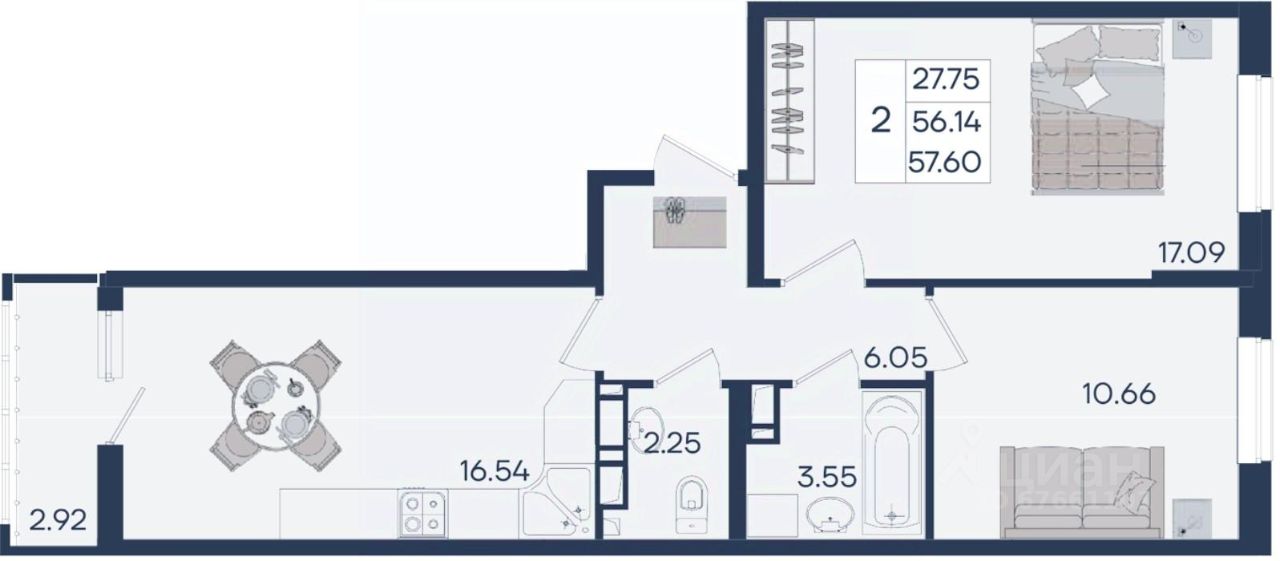 2 комнатная квартира с ремонтом 57.6 м², на 5 этаже в жилом комплексе ''Дом 101''.