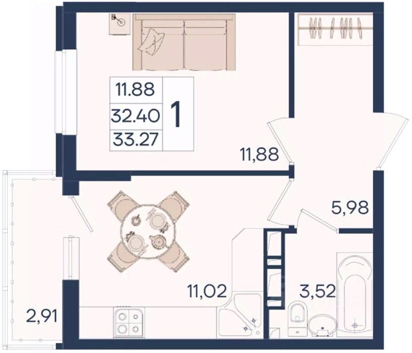 1 комнатная квартира с ремонтом 33.27 м², на 11 этаже в жилом комплексе ''Дом 101''.