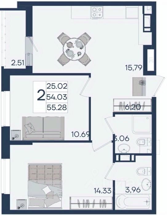 2 комнатная квартира с ремонтом 55.28 м², на 6 этаже в жилом комплексе ''Дом 101''.