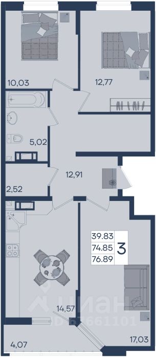 3 комнатная квартира с ремонтом 76.89 м², на 3 этаже в жилом комплексе ''Дом 101''.