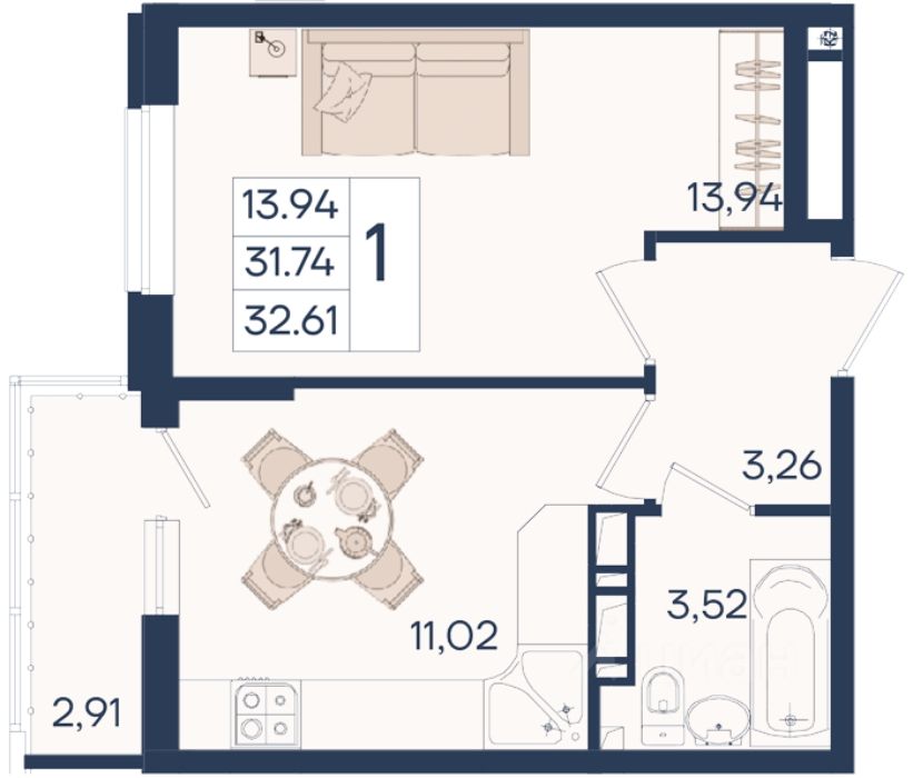 1 комнатная квартира с ремонтом 32.61 м², на 4 этаже в жилом комплексе ''Дом 101''.