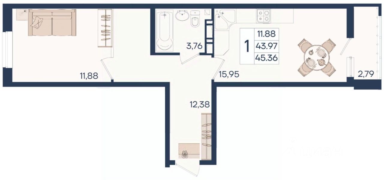 1 комнатная квартира с ремонтом 45.36 м², на 9 этаже в жилом комплексе ''Дом 101''.