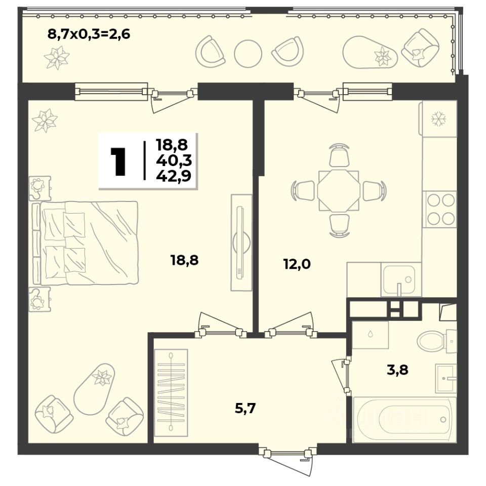 Общая площадь42,9 м2