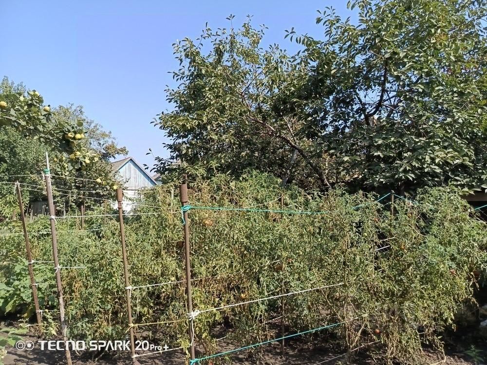 На участке посажены плодоносящие деревья, цветы.