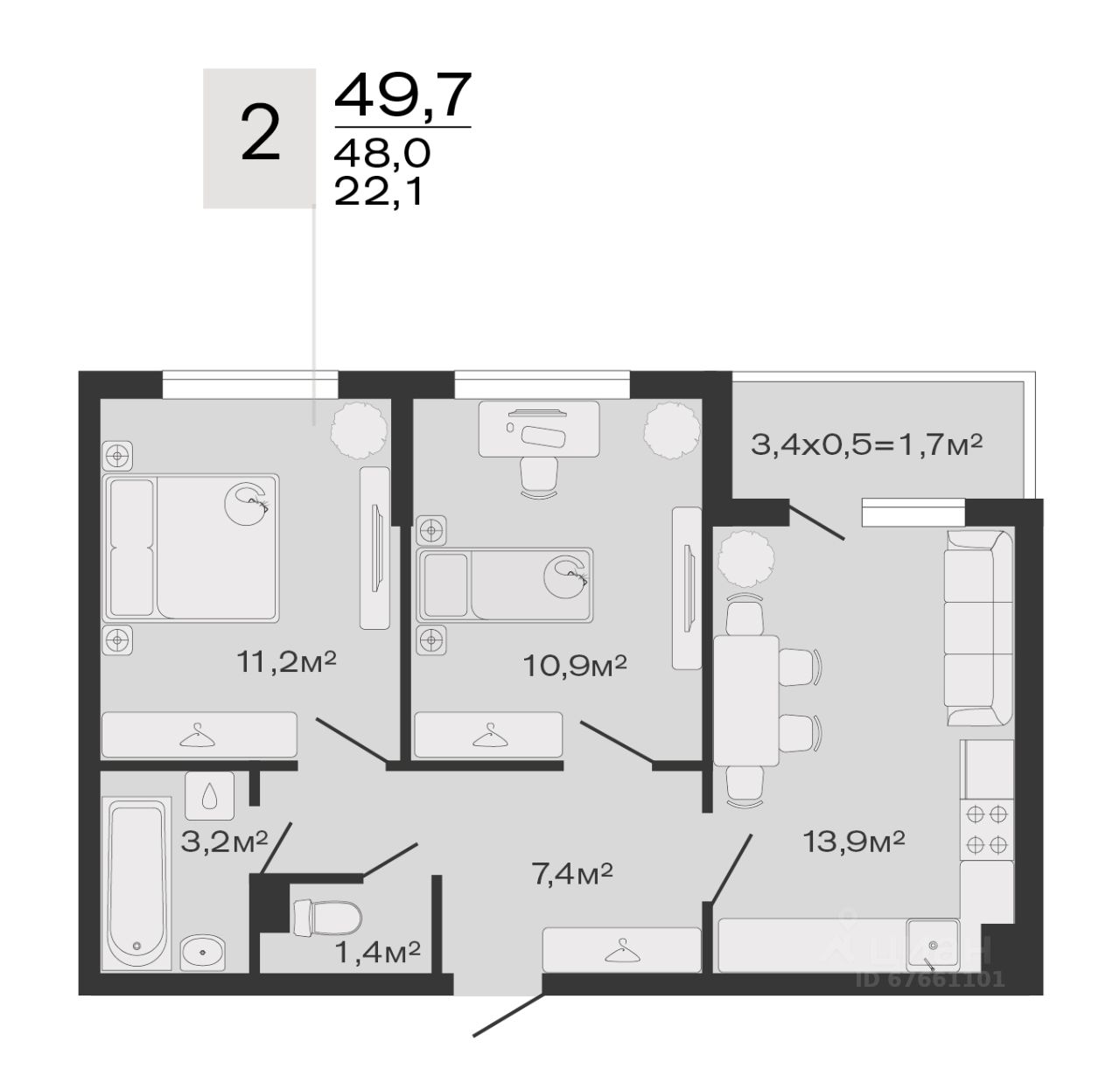 продам 2-к, Дзенпарк ЖК, 45 467 000 ₽