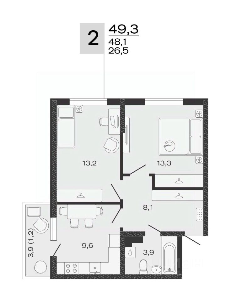 Общая площадь49,3 м2