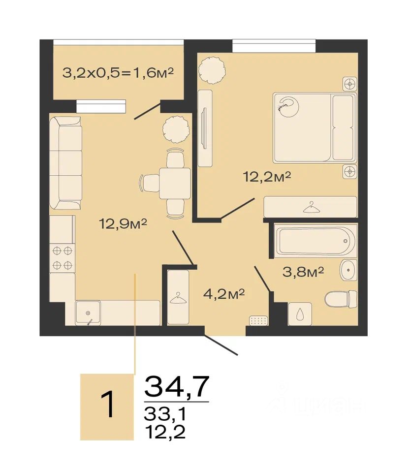 Общая площадь34,7 м2