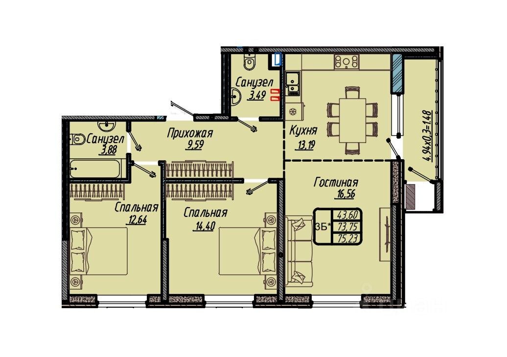 Общая площадь75,23 м2