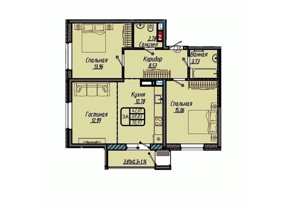 Общая площадь70,97 м2